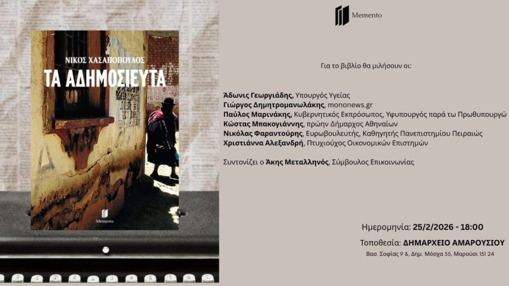 Η έκδοση θα παρουσιαστεί την Τετάρτη 25 Φεβρουαρίου 2026, στις 6 το απόγευμα, στο Δημαρχείο Αμαρουσίου [Βασιλίσσης Σοφίας 9 & Μόσχα Δημήτριου, 15124 Μαρούσι].