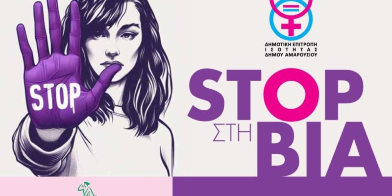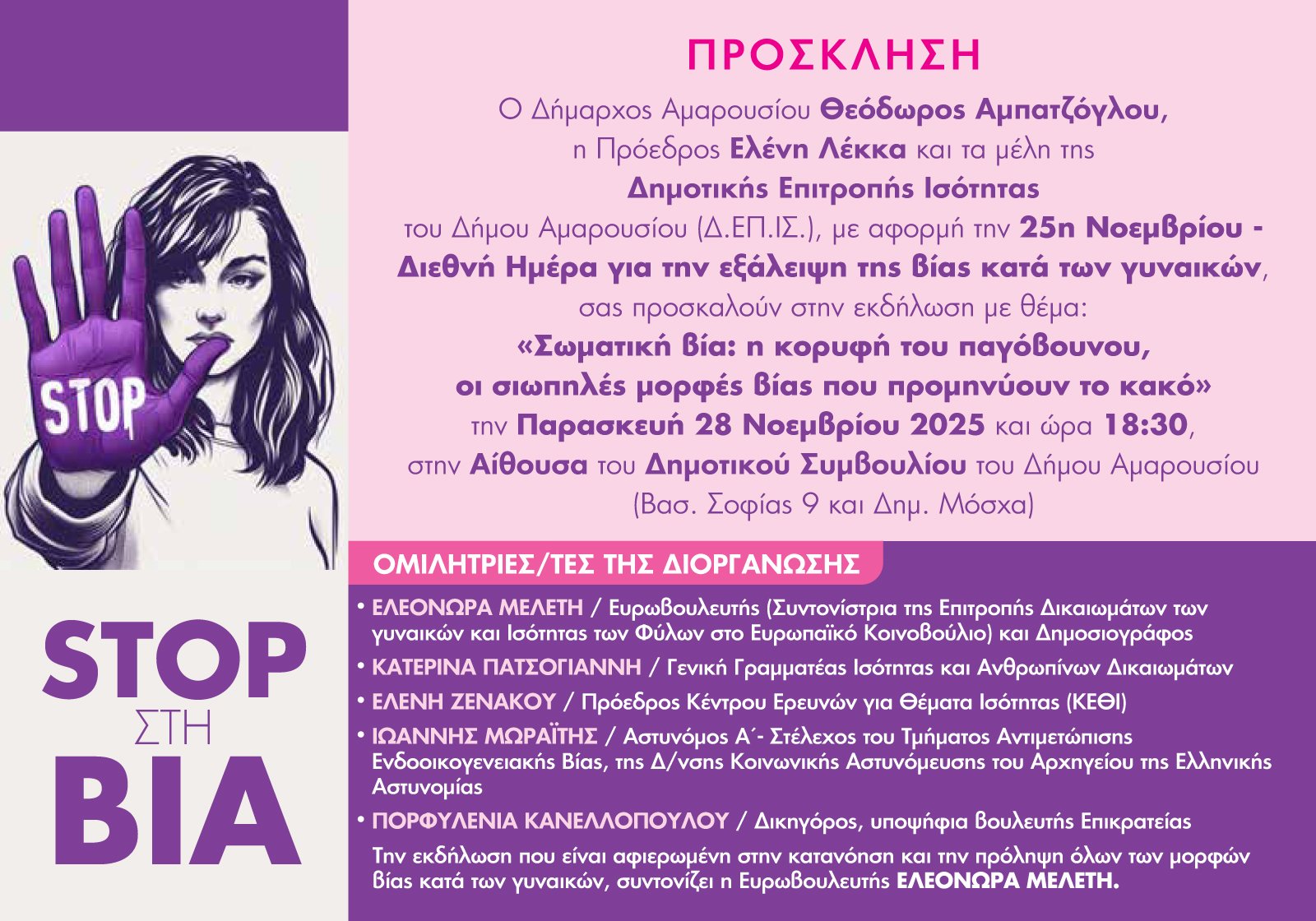 Ο Δήμαρχος Αμαρουσίου Θεόδωρος Αμπατζόγλου, η Πρόεδρος Ελένη Λέκκα και τα μέλη της Δημοτικής Επιτροπής Ισότητας του Δήμου Αμαρουσίου (Δ.ΕΠ.ΙΣ.), με αφορμή την 25η Νοεμβρίου – Διεθνή Ημέρα για την εξάλειψη της βίας κατά των γυναικών, σας προσκαλούν στην εκδήλωση με θέμα: «Σωματική βία: η κορυφή του παγόβουνου, οι σιωπηλές μορφές βίας που προμηνύουν το κακό» την Παρασκευή 28 Νοεμβρίου 2025 και ώρα 18:30, στην Αίθουσα του Δημοτικού Συμβουλίου του Δήμου Αμαρουσίου