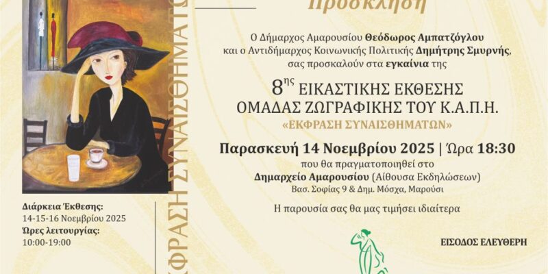 Ο Δήμαρχος Αμαρουσίου Θεόδωρος Αμπατζόγλου και ο Αντιδήμαρχος Κοινωνικής Πολιτικής Δημήτρης Σμυρνής, σας προσκαλούν στα εγκαίνια της 8ης ΕΙΚΑΣΤΙΚΗΣ ΕΚΘΕΣΗΣ ΟΜΑΔΑΣ ΖΩΓΡΑΦΙΚΗΣ ΤΟΥ Κ.Α.Π.Η. «ΕΚΦΡΑΣΗ ΣΥΝΑΙΣΘΗΜΑΤΩΝ»