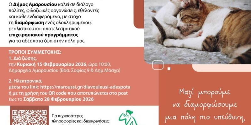 Με επιτυχία πραγματοποιήθηκε την Κυριακή 15 Φεβρουαρίου 2026, στο Δημαρχείο Αμαρουσίου, η δημόσια διαβούλευση που διοργάνωσε ο Δήμος Αμαρουσίου για το νέο Επιχειρησιακό Πρόγραμμα Διαχείρισης Αδέσποτων Ζώων Συντροφιάς & Πρόληψης Δημιουργίας Νέων Αδέσποτων (2025–2026).