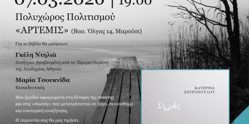 Ο Δήμαρχος Αμαρουσίου Θεόδωρος Αμπατζόγλου και η Αντιδήμαρχος Πολιτισμού Ειρήνη-Μαρία Χαλιώτη, σας προσκαλούν στην παρουσίαση του νέου ποιητικού βιβλίου της Κατερίνας Σπυροπούλου από τις ΑΩ Εκδόσεις, με τίτλο: «Σιωπές» που θα πραγματοποιηθεί το Σάββατο 7 Μαρτίου 2026, στις 19:00, στον Πολυχώρο Πολιτισμού «ΑΡΤΕΜΙΣ» (Βασ. Όλγας 14, Μαρούσι).