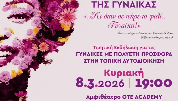 Ο Δήμαρχος Αμαρουσίου Θεόδωρος Αμπατζόγλου, η Πρόεδρος της Δημοτικής Επιτροπής Ισότητας των Φύλων (ΔΕ.ΠΙ.Σ.) του Δήμου Αμαρουσίου Ελένη Λέκκα και η Αντιδήμαρχος Πολιτισμού Ειρήνη – Μαρία Χαλιώτη,σας προσκαλούν στην τιμητική εκδήλωση για τις ΓΥΝΑΙΚΕΣ ΜΕ ΠΟΛΥΕΤΗ ΠΡΟΣΦΟΡΑ ΣΤΗΝ ΤΟΠΙΚΗ ΑΥΤΟΔΙΟΙΚΗΣΗ την Κυριακή 8 Μαρτίου 2026 και ώρα 19:00, στο Αμφιθέατρο ΟΤΕ ACADEMY (Πέλικα & Σπάρτης 1, Μαρούσι).
