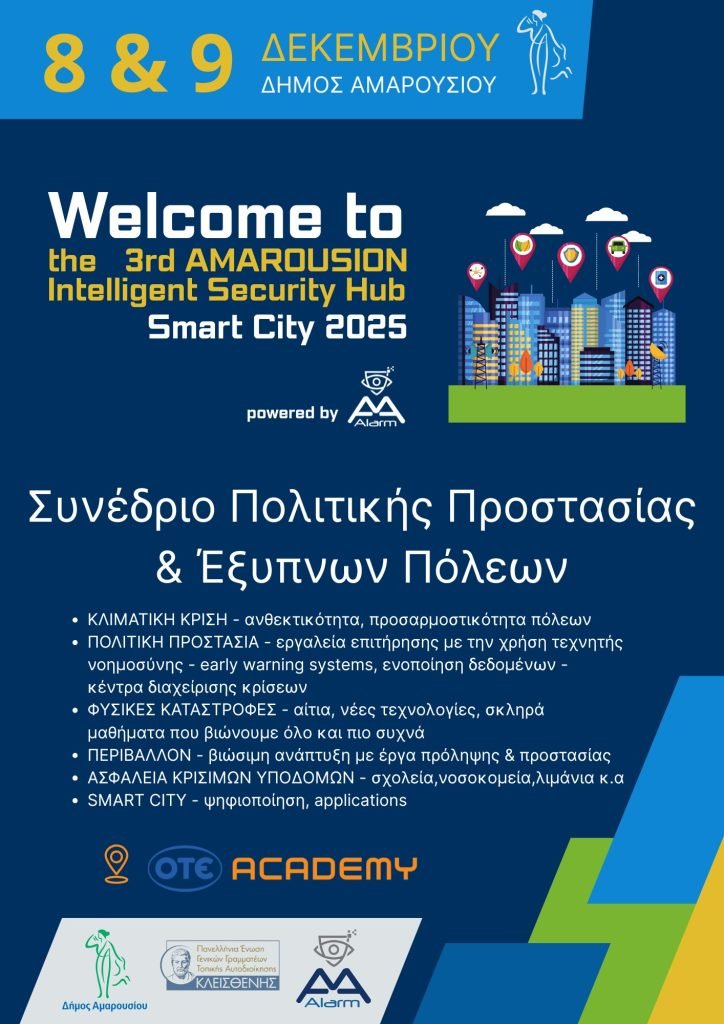 Ο Δήμος Αμαρουσίου, η Ένωση Γενικών Γραμματέων Τοπικής Αυτοδιοίκησης «Κλεισθένης» και η εταιρεία AA-ALARM συνδιοργανώνουν το 3ο Συνέδριο Πολιτικής Προστασίας & Έξυπνων Πόλεων, το οποίο θα πραγματοποιηθεί στις 8…