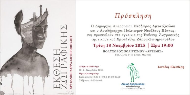 Ο Δήμαρχος Αμαρουσίου Θεόδωρος Αμπατζόγλου και ο Αντιδήμαρχος Πολιτισμού Νικόλαος Πέππας, σας προσκαλούν στα εγκαίνια της Έκθεσης Ζωγραφικής της εικαστικού Χρυσάνθης Ζάρρα-Σωτηροπούλου την Τρίτη 18 Νοεμβρίου 2025 και ώρα 19:00 στον Πολυχώρο Πολιτισμού «Άρτεμις» (Βασ. Όλγας…