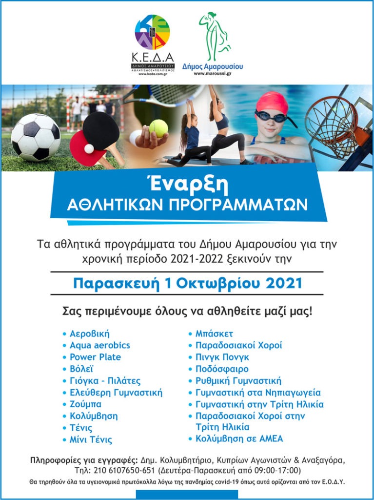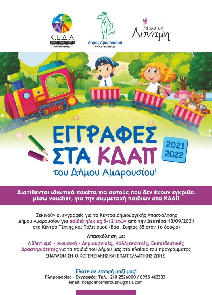 Ξεκίνησαν από τη Δευτέρα 13 Σεπτεμβρίου 2021 οι εγγραφές για τα Κέντρα Δημιουργικής Απασχόλησης του Δήμου Αμαρουσίου (ΚΔΑΠ), στο Κέντρο Τέχνης και Πολιτισμού (Βασ. Σοφίας 85, Μαρούσι, στον 1ο όροφο).